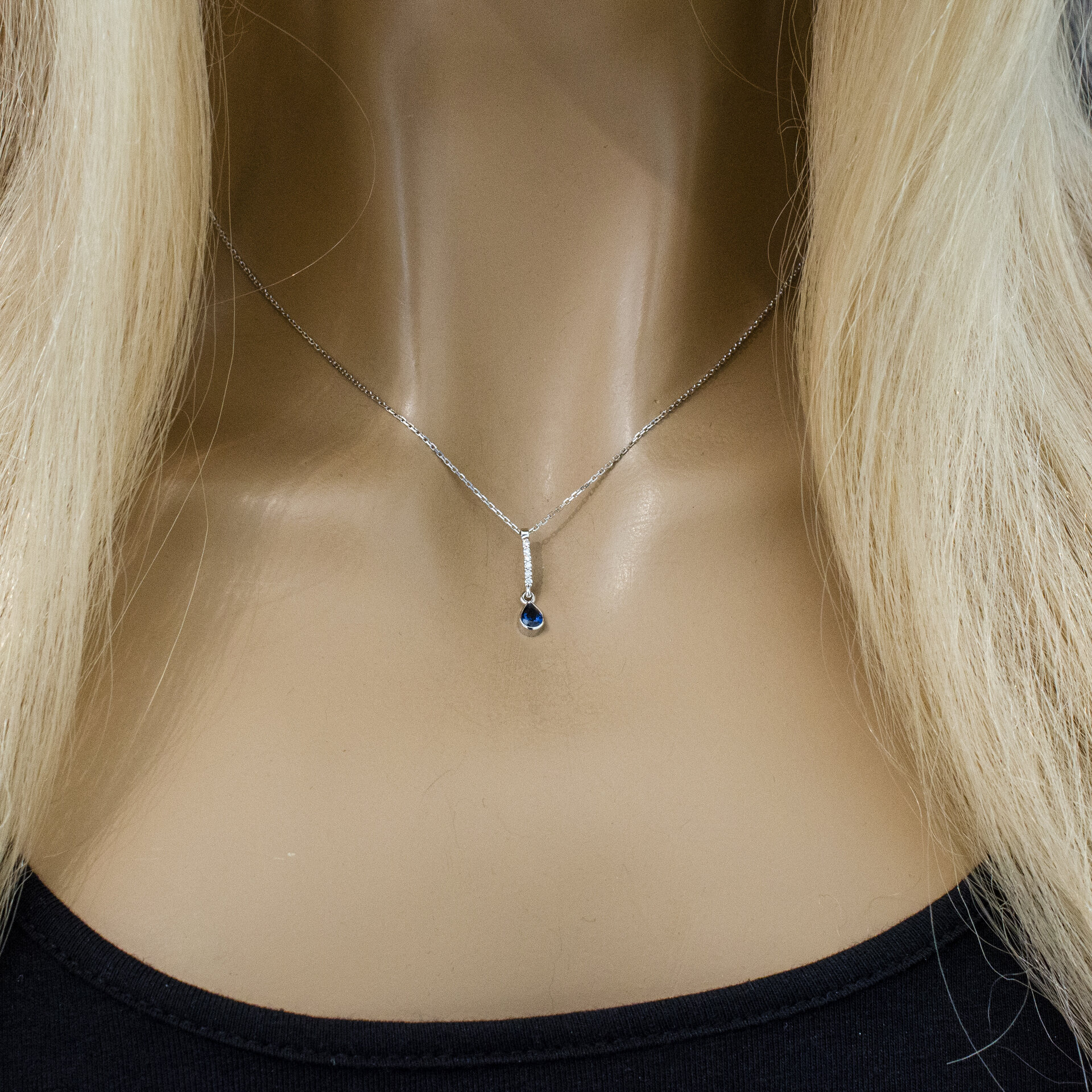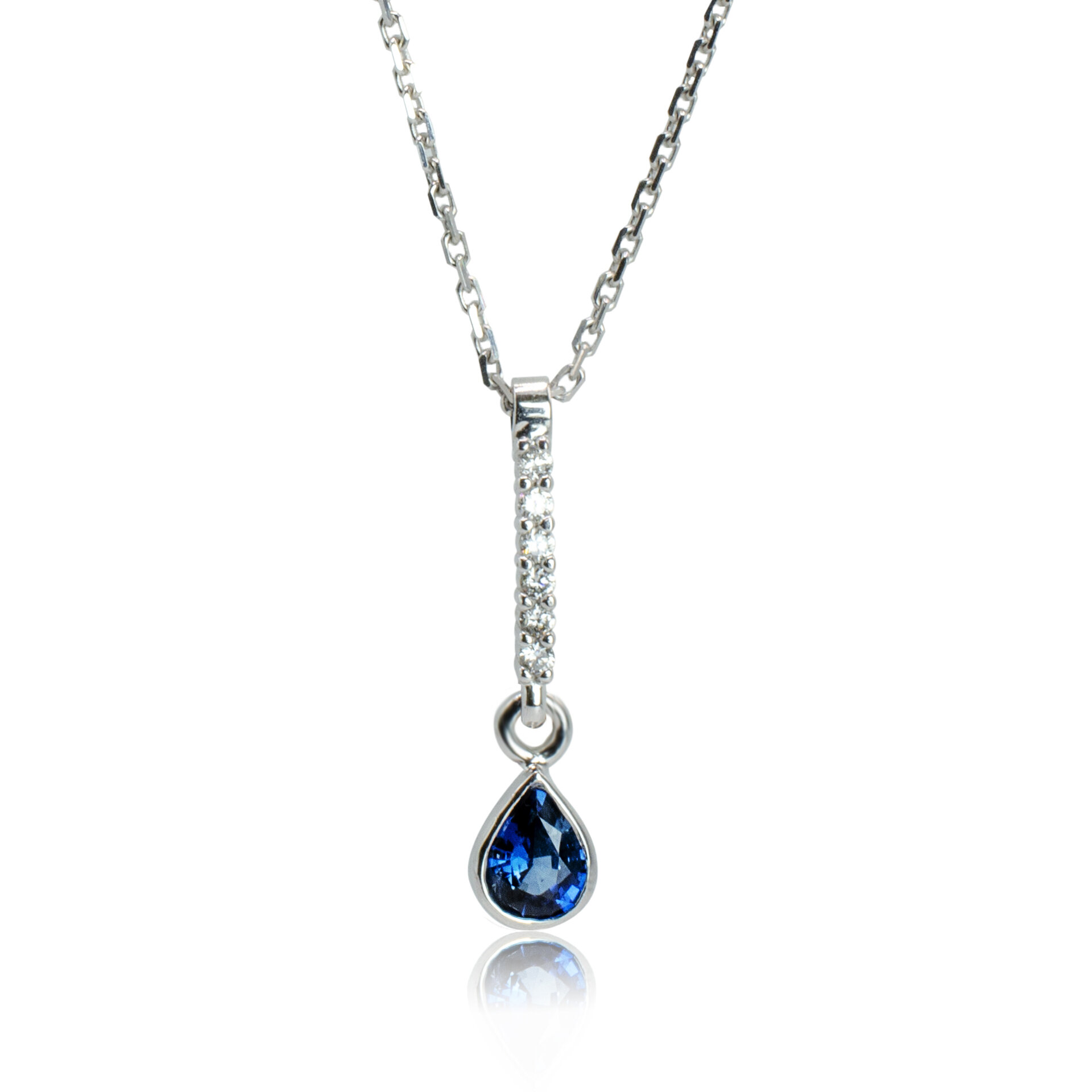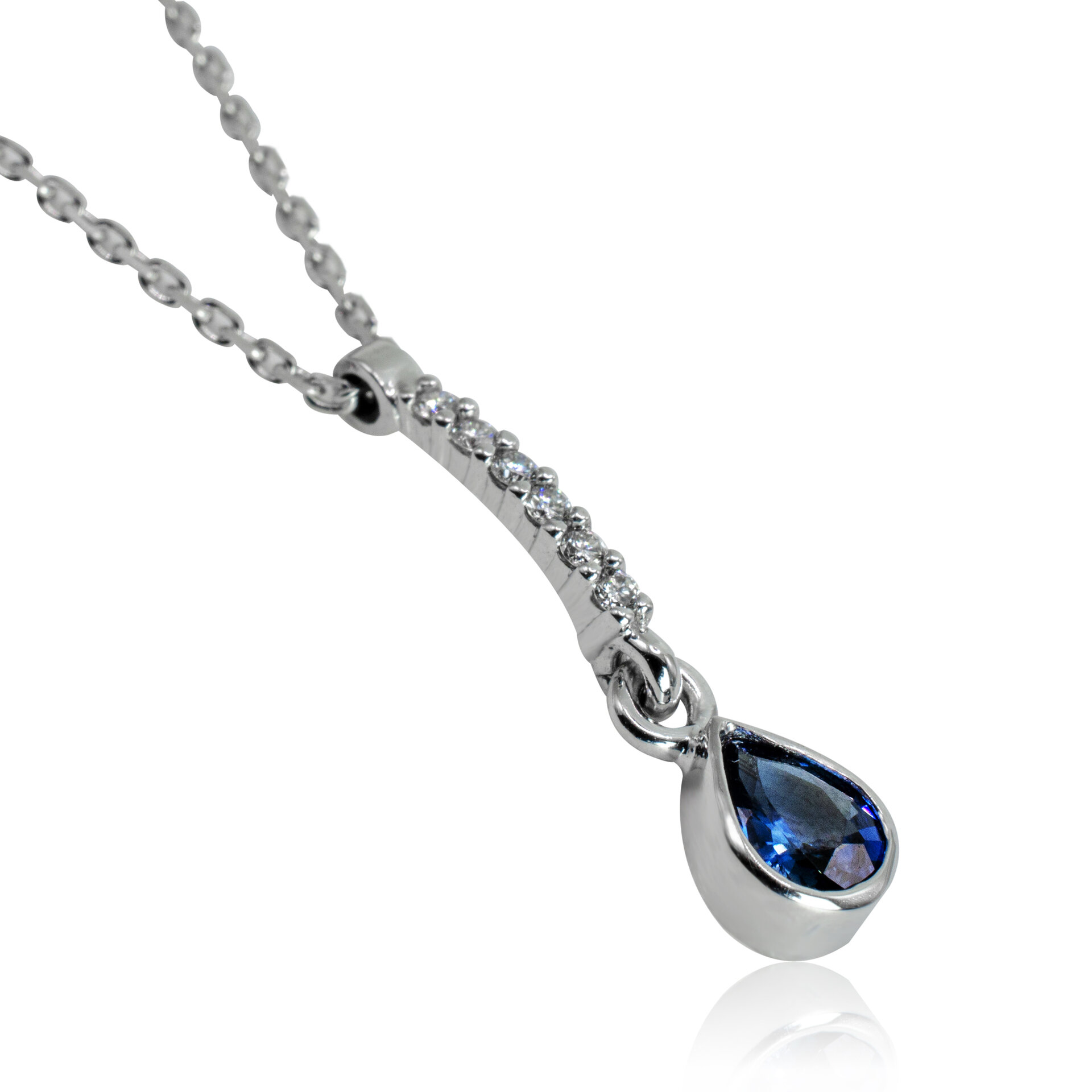 Diamantový náhrdelník je vyrobený ručnou precíznou prácou z lesklého bieleho zlata. Vyníma sa prírodný zafír s výbrusom pantlok v rozmeroch 4,5 x 3,6 mm x 1,95 mm vsadený do obruby zlata. Nad zafírom sú umiestnené žiarivé prírodné diamanty v okrúhlom briliantovom výbruse, uchytené krapňami. Súčasťou prívesku je jemná avšak veľmi pevná anker retiazka s nastaviteľnými dĺžkami 45 cm a 42 cm. Prívesok na retiazke je pohyblivý. Zapínanie retiazky je na skákací krúžok. Dĺžka ozdobnej časti je 18,5 mm a šírka 4,3 mm. Orientačná váha náhrdelníka je 1,86 g. Parametre diamantov a zafíru: prírodný zafír 1 ks - karátová váha 0,215 ct – výbrus pantlok kombinovaný, farba tmavomodrá transparentná, úprava (TE); prírodné diamanty rozmer 1,15 mm x 6 ks - karátová váha celkom 0,039 ct, čistota SI1 farba vzácne biela F-G-H. Šperk posielame v luxusnej darčekovej krabičke s certifikátom pravosti prírodných diamantov a prírodných drahých kameňov.