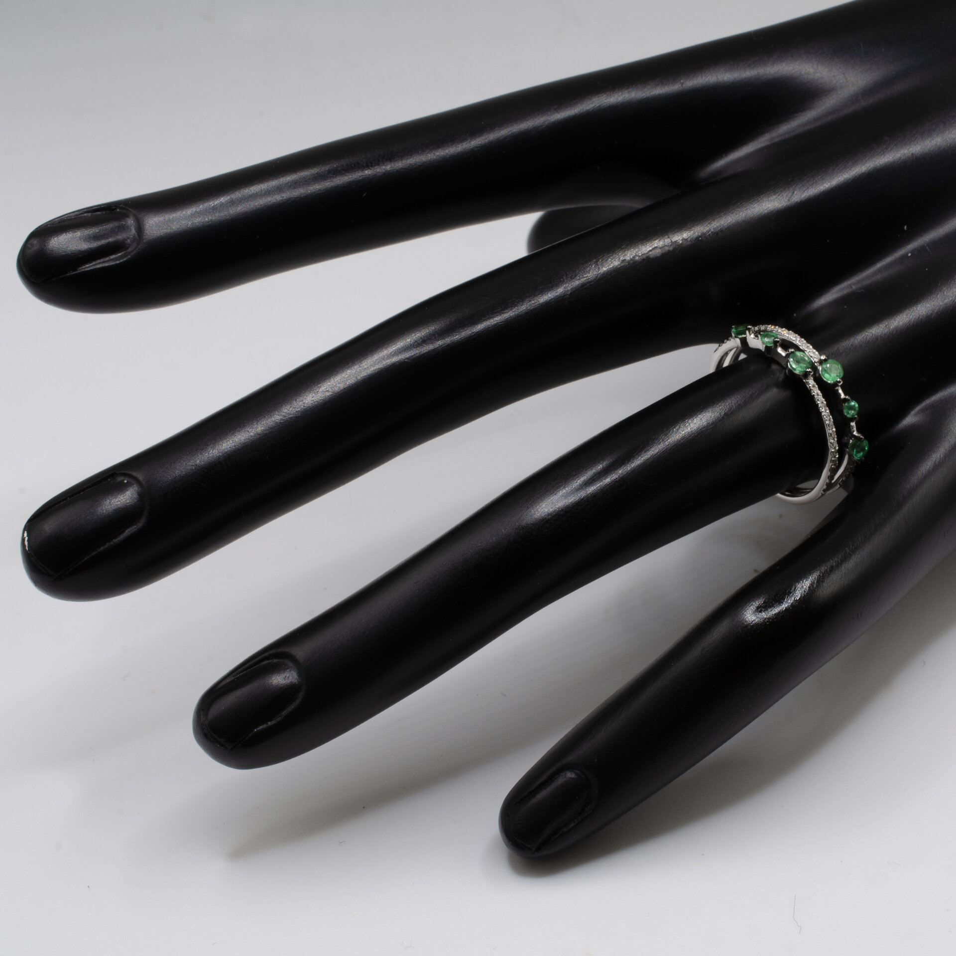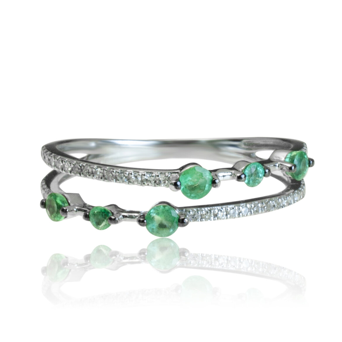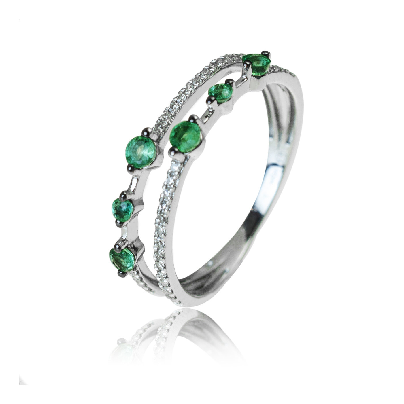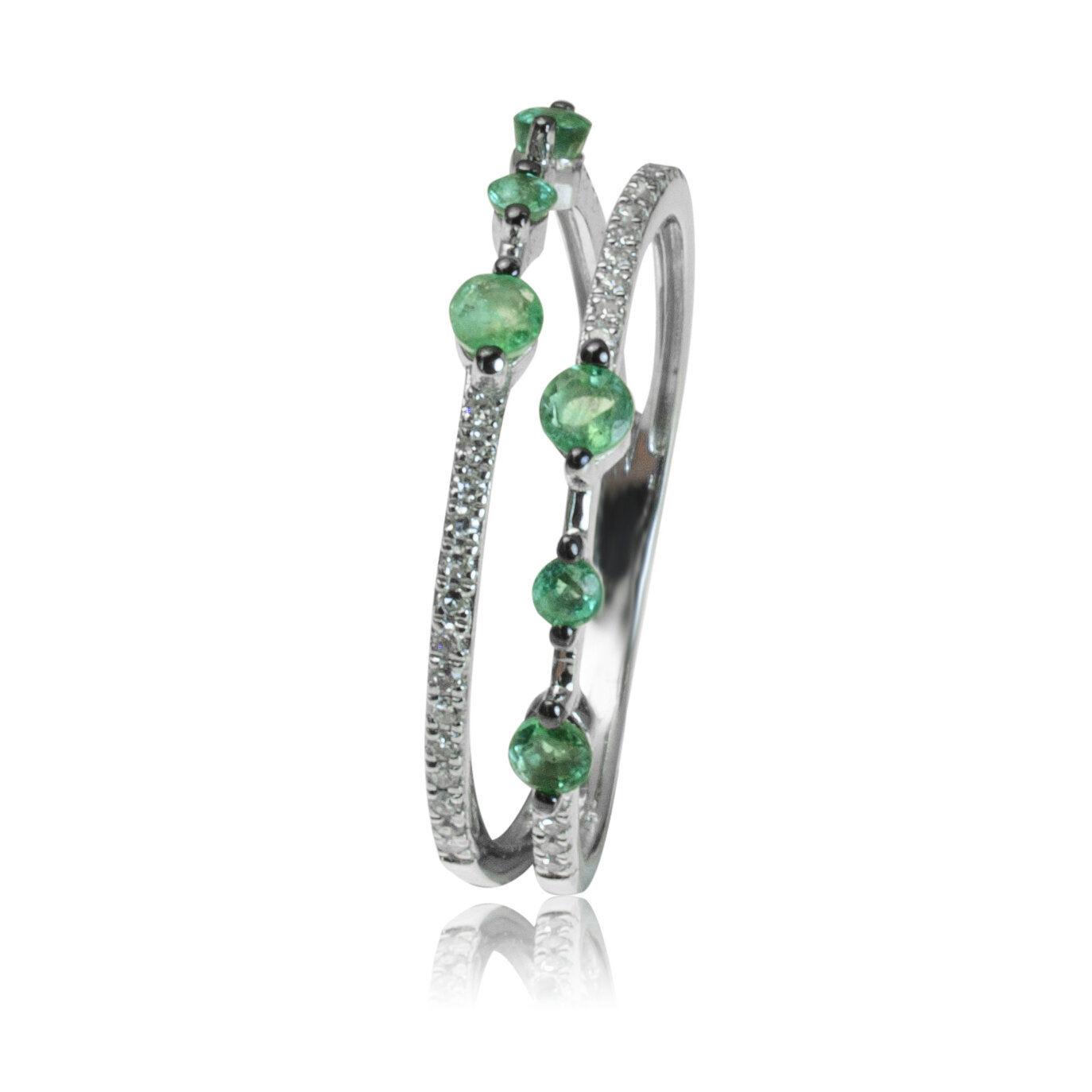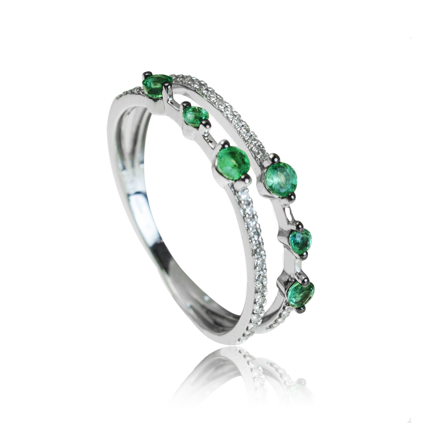 Zlatý prsteň vyrobený z lesklého bieleho zlata. Zaujímavý moderný dizajn dotvárajú osadené smaragdy v okrúhlom tvare s malými diamantmi v okrúhlom briliantovom výbruse. Hmotnosť prsteňa pri veľkosti 53 je 1,26 g. Parametre diamantov a smaragdov: diamanty celkom: 0,10 ct SI1/G; smaragdy celkom 0,25 ct. Šperk posielame v luxusnej darčekovej krabičke s certifikátom pravosti prírodných diamantov a drahokamov.