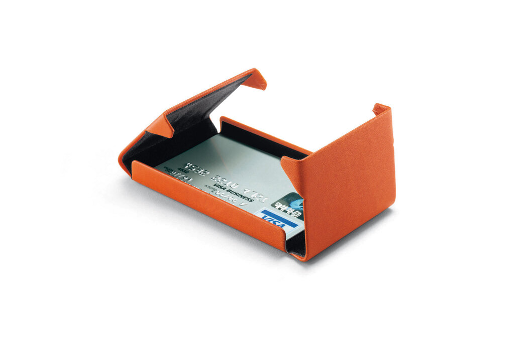 Svetová značka GIORGIO FEDON – len u nás! Vizitkár na úschovu vizitiek alebo čipových kariet. Má vertikálny samo-uzamykací systém. Je dostupný v čiernej a oranžovej farbe. Rozmery: 5,9x9,4x1,3 cm. Vizitkár posielame v luxusnej darčekovej krabičke.