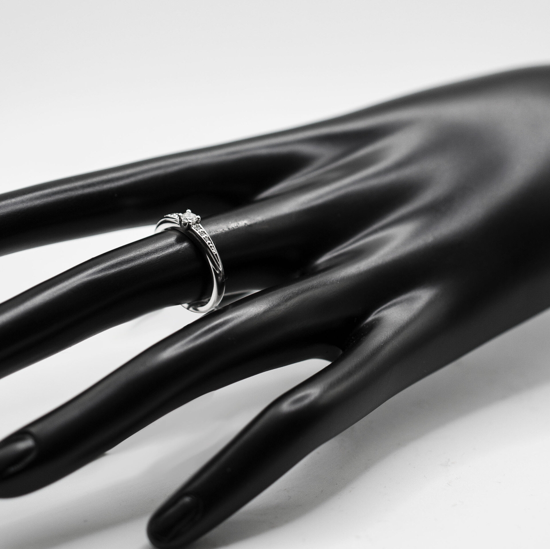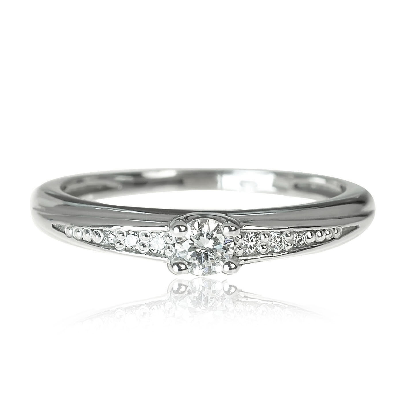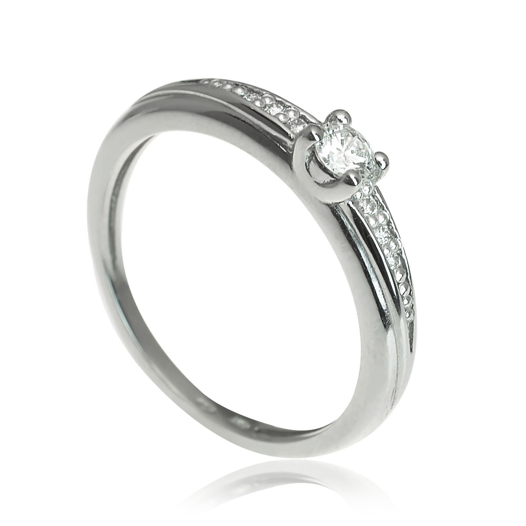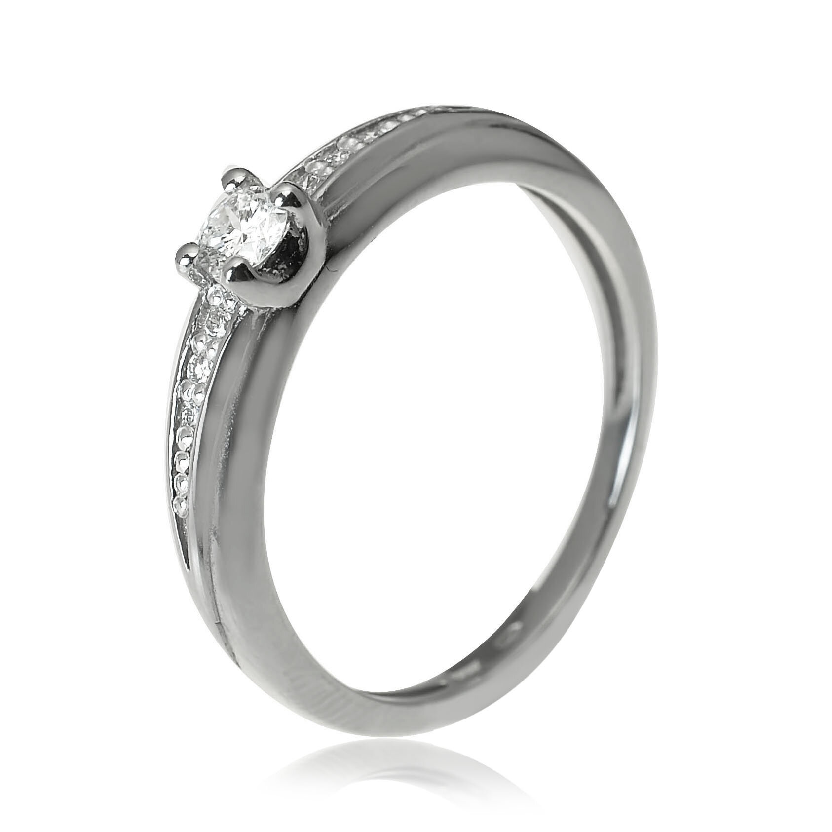 Diamantový prsteň vyrobený z lesklého bieleho zlata. Korunku tvorí centrálny diamant uchytený štyrmi krapňami. Po bokoch šíny sú osadené prírodné diamanty, ktoré dodávajú šperku krásne žiarivý dizajn. Diamanty s certifikátom 0,148 ct SI1/G. Hmotnosť prsteňa pri veľkosti 51 je 2,05 g. Šperk posielame v luxusnej darčekovej krabičke s certifikátom pravosti prírodných diamantov.