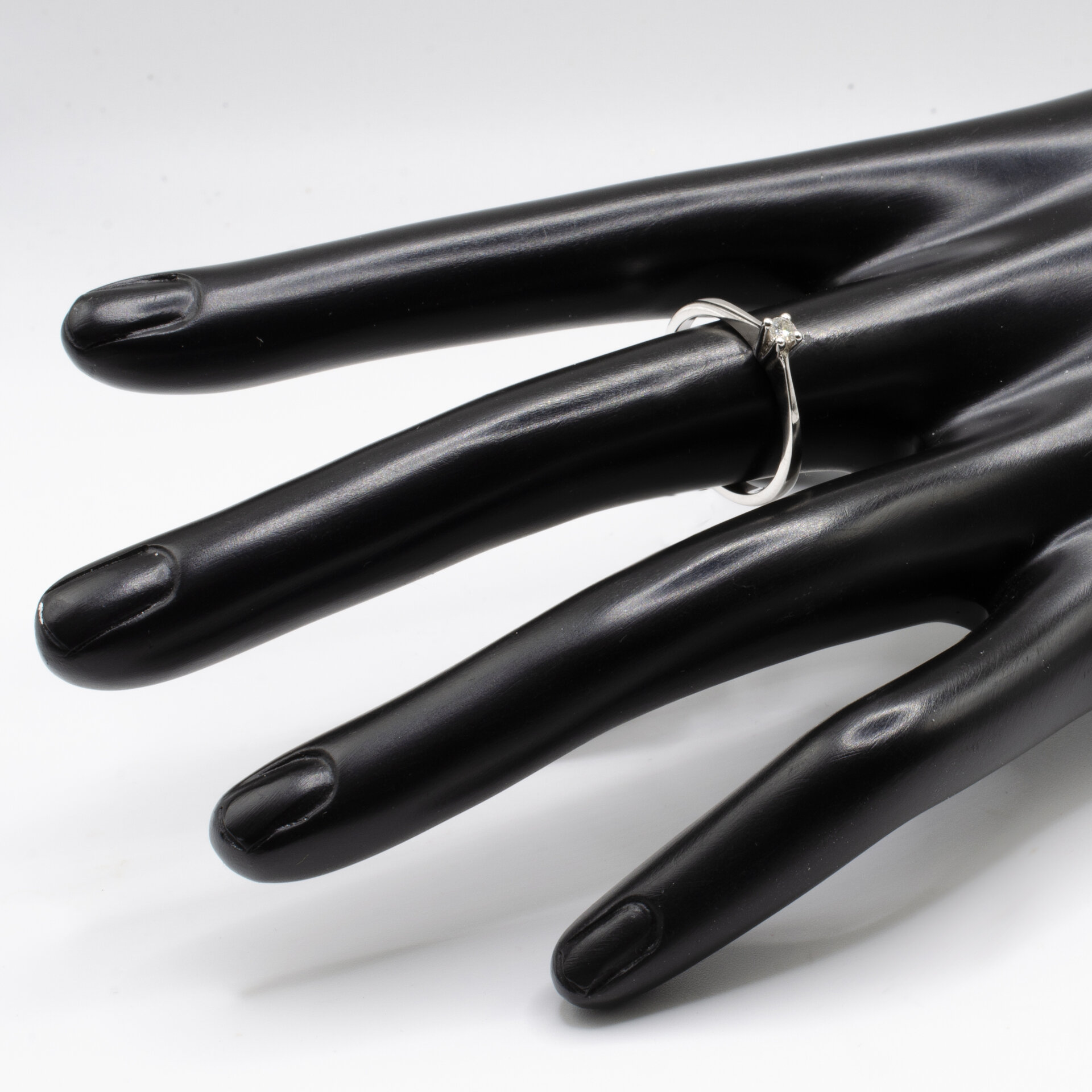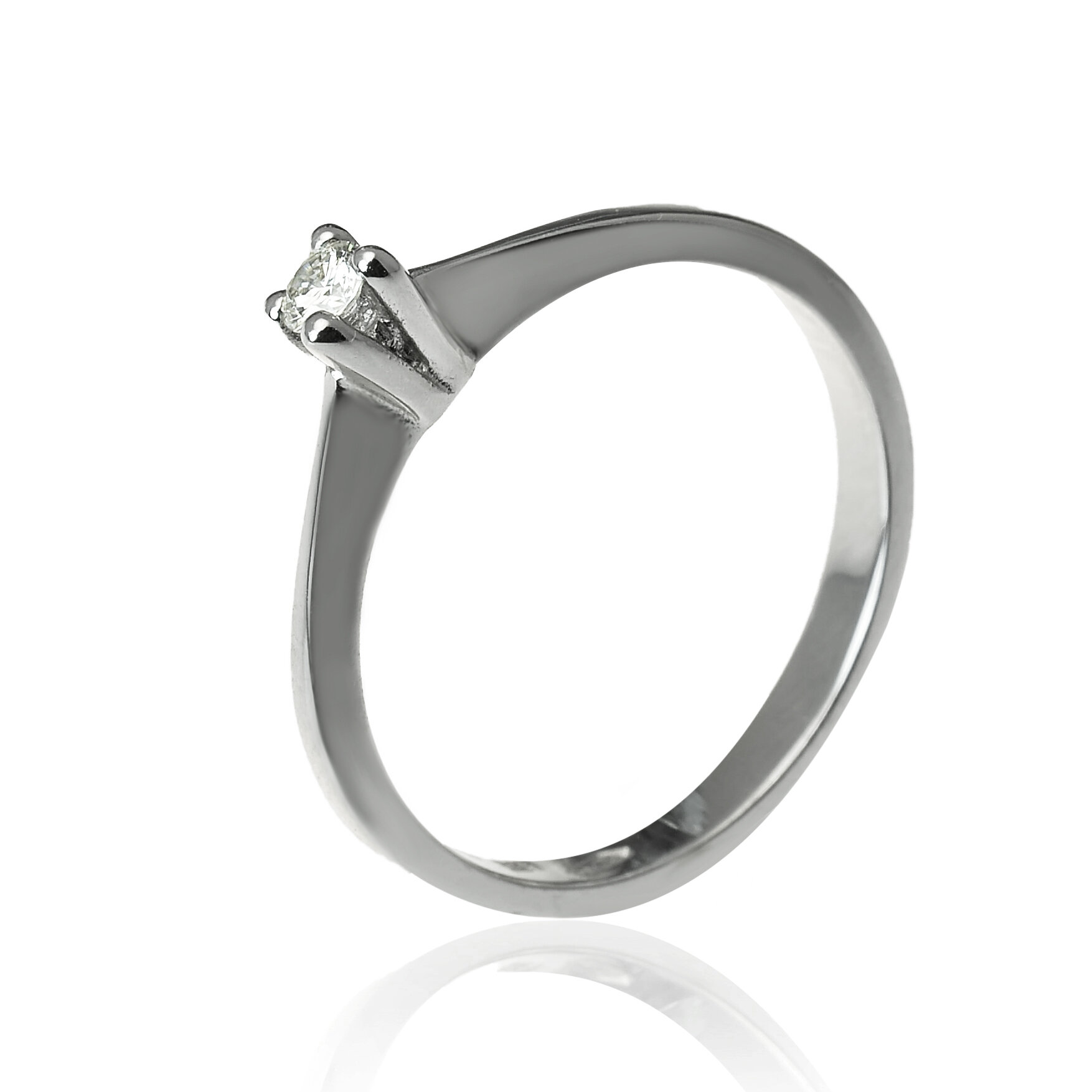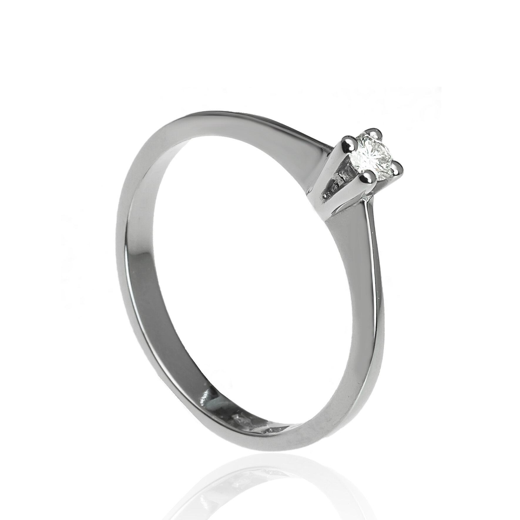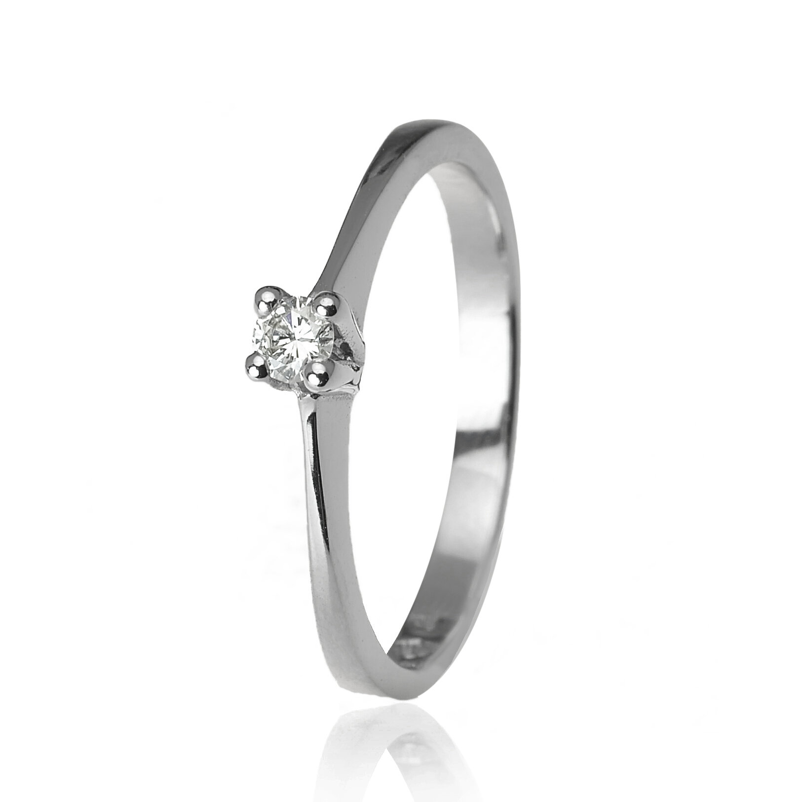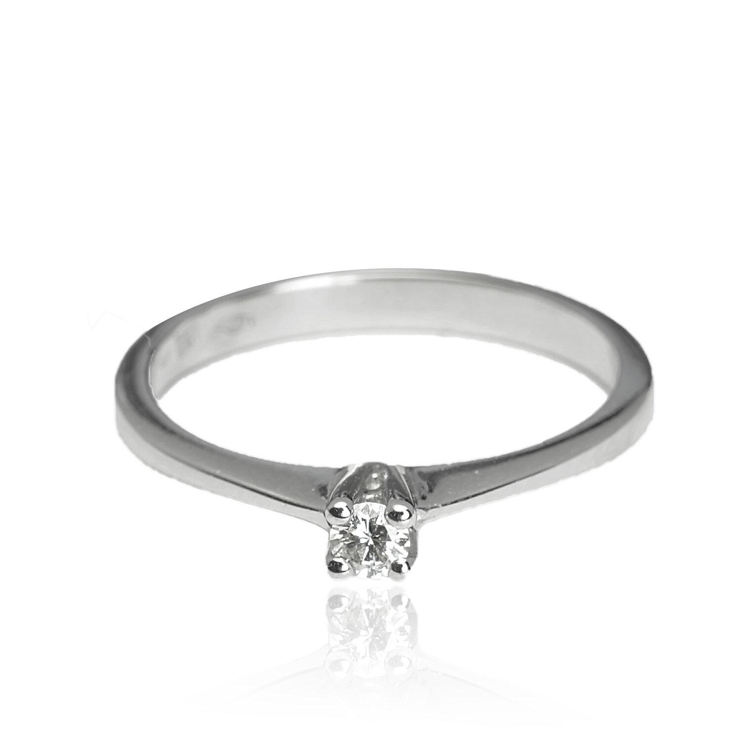 Zlatý prsteň vyrobený z lesklého bieleho zlata. Diamant s rozmerom 2,5 mm je osadený v masívnej vysokej korunke formovanej zo štyroch krapní. Línia šíny je veľmi jemná a rafinovaná, smerom k briliantu sa zužuje. Diamant s certifikátom 0,08 ct VS/G. Hmotnosť prsteňa pri veľkosti 54 je 2,00 g. Šperk posielame v luxusnej darčekovej krabičke s certifikátom pravosti prírodných diamantov.