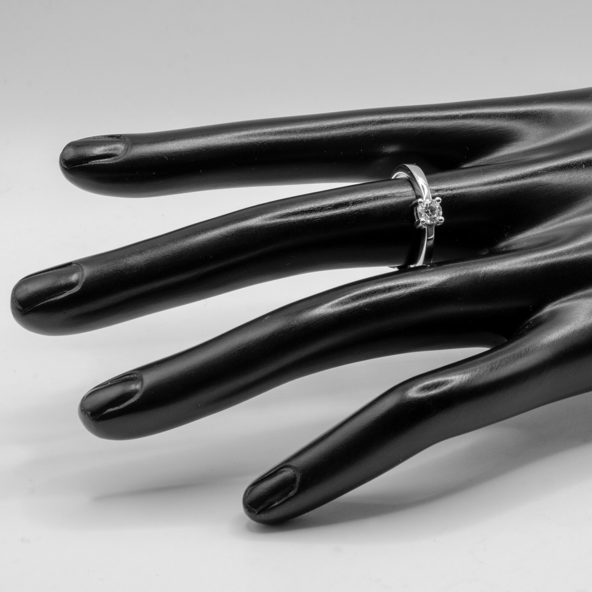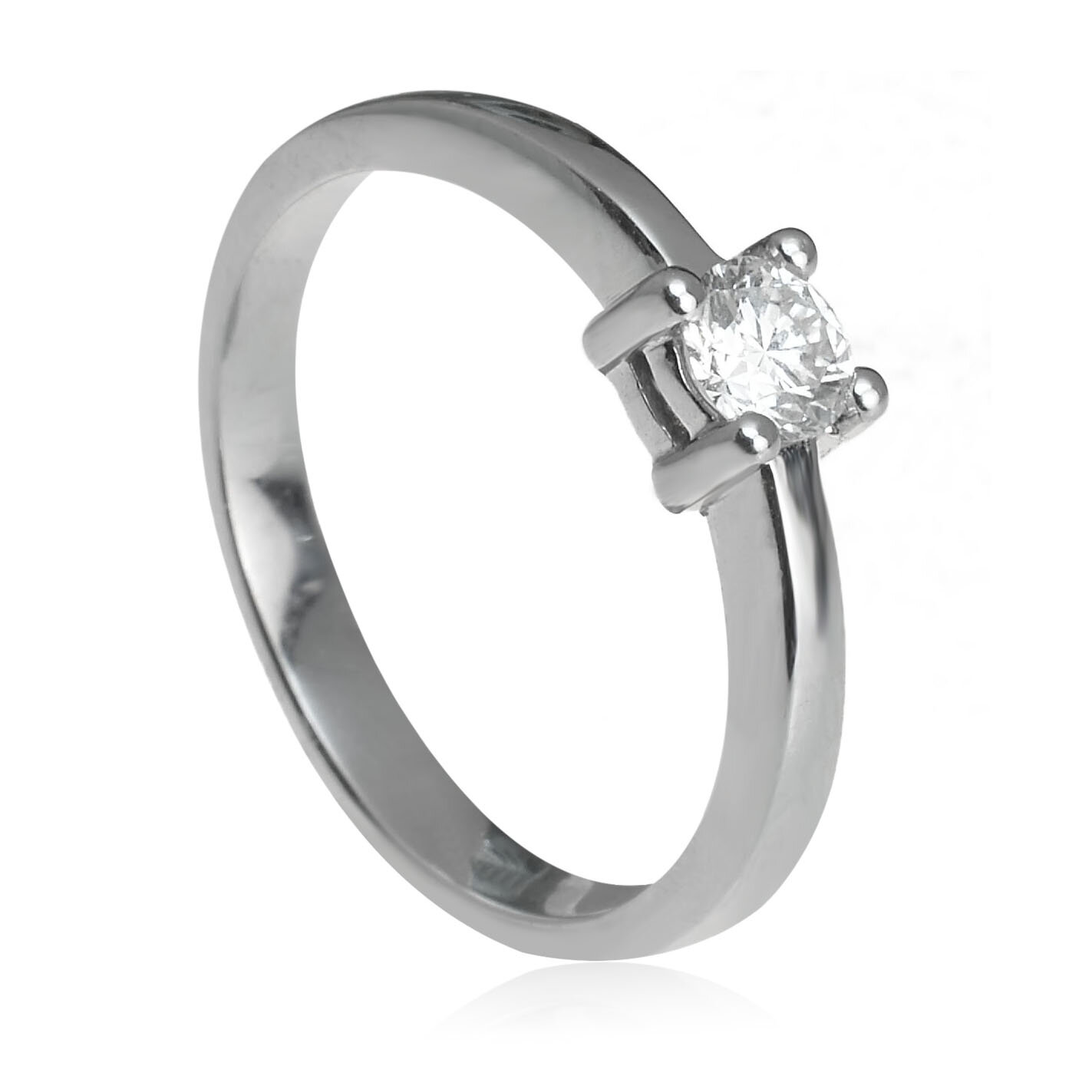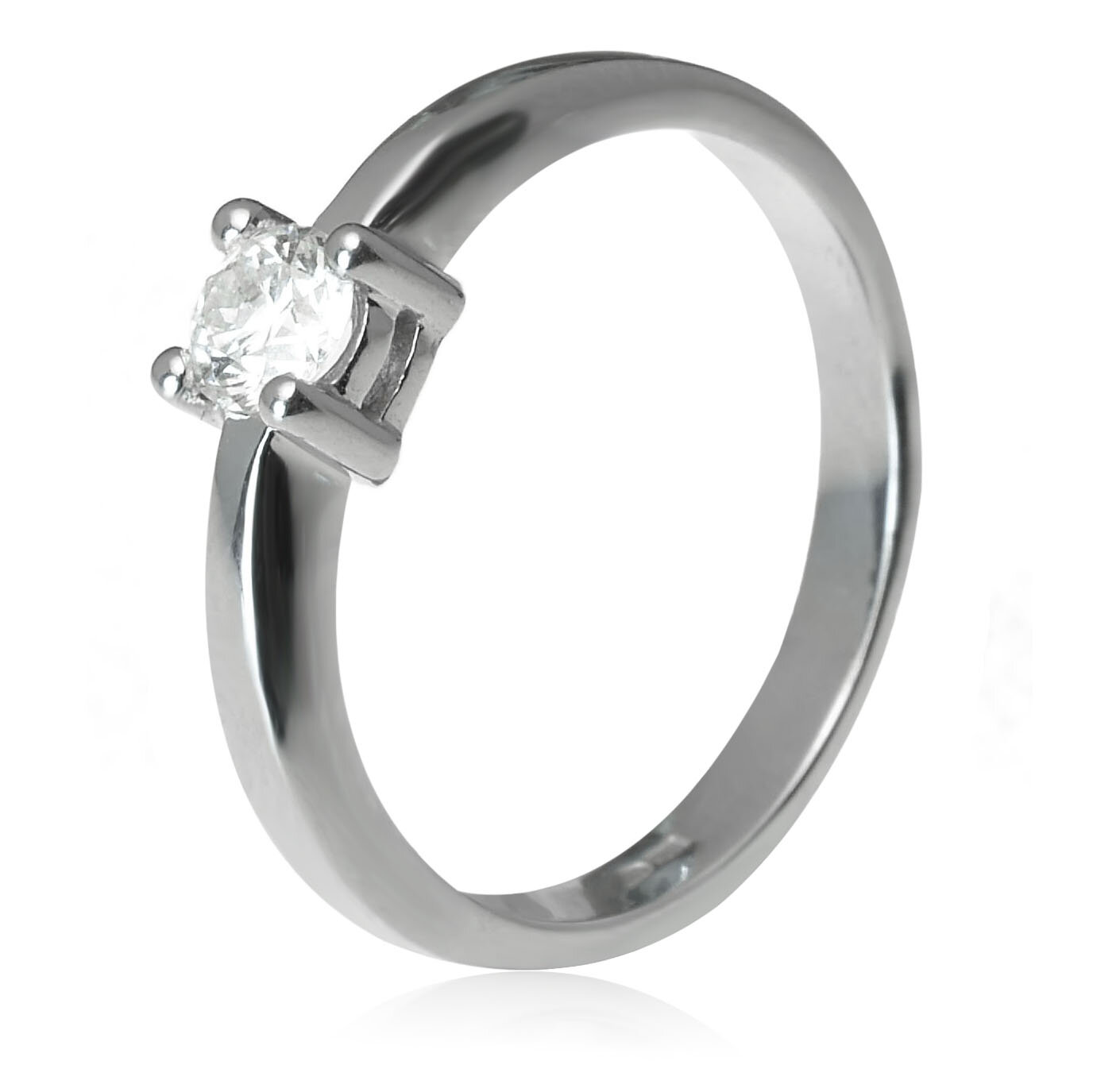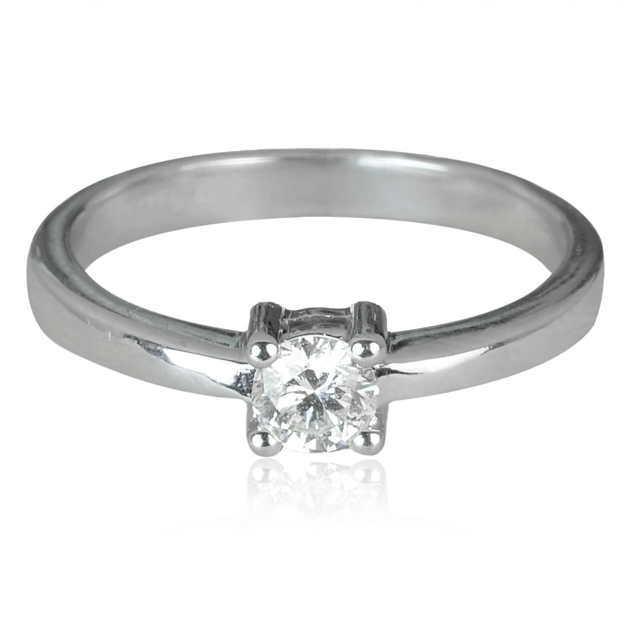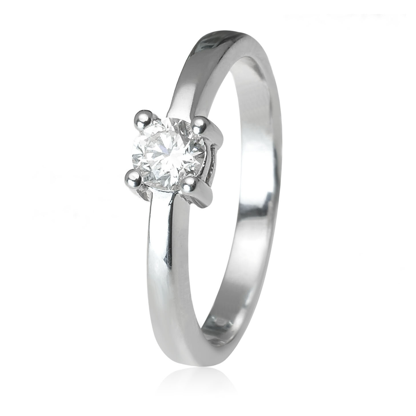 Jednoduchý dámsky prsteň vyrobený z lesklého bieleho zlata. Na vrchu nízkej korunky je vsadený trblietavý diamant vo veľkosti 4 mm, ktorý je zachytený v 4 krapniach. Korunka je v strede delená na 2 časti. Hmotnosť šperku pri veľkosti 55 je 3,10 g. Diamant s certifikátom 0,29 ct, SI/G. Šperk posielame v luxusnej darčekovej krabičke s certifikátom pravosti prírodných diamantov.